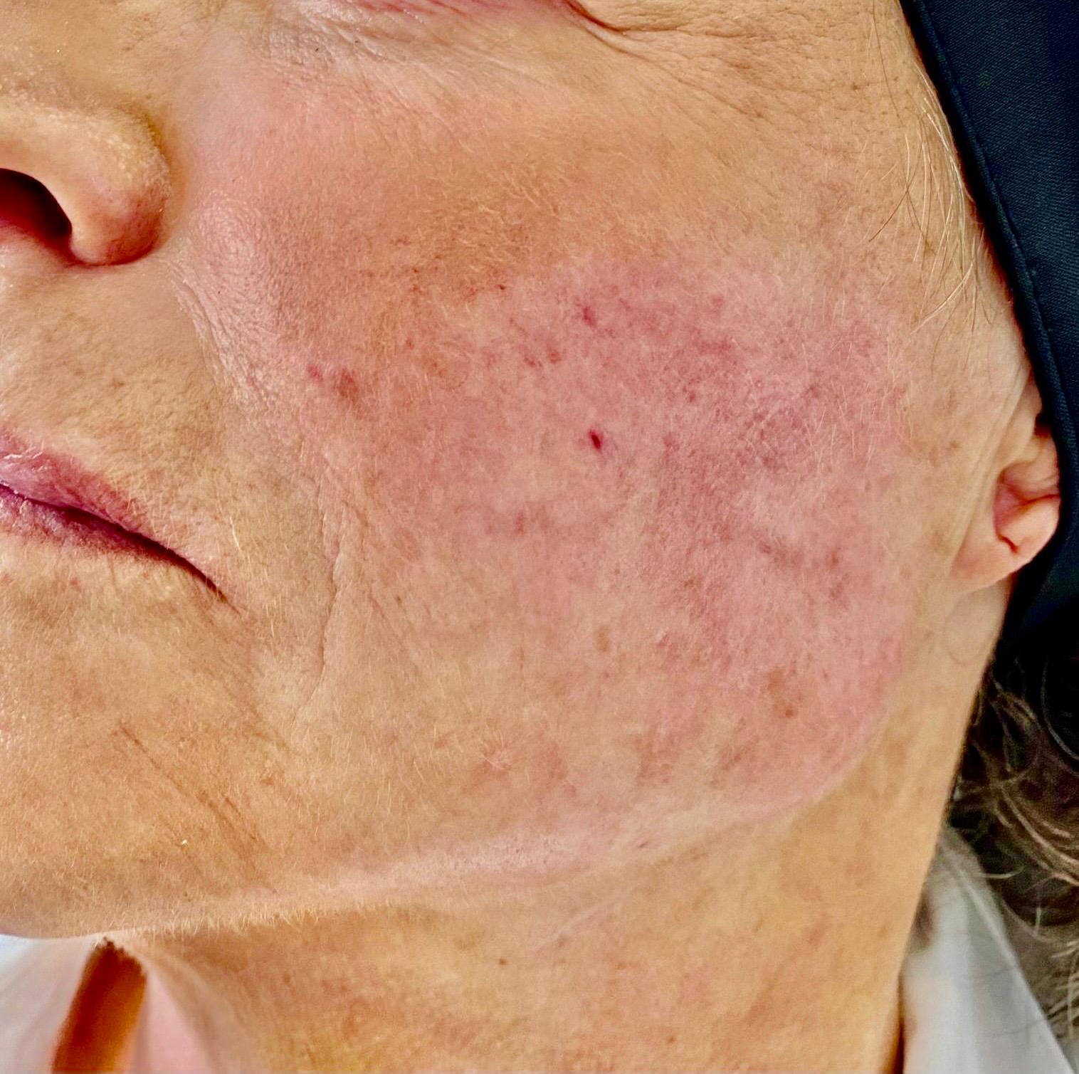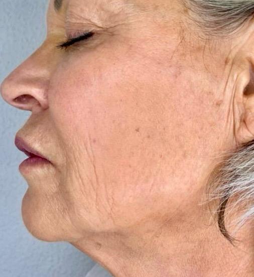 Behandlung der “Hängebäckchen” und des Volumenverlustes der Wangen mittels Hydroxylappatit (Radiesse©️); Akzentuierung der Unterkieferkante.